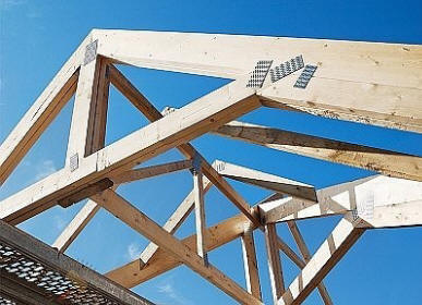 Для обеспечения надёжного соединения отдельных частей стропильной системы применяются специальные крепёжные элементы. Используемый при монтаже стропильной системы строительный крепёж может быть как деревянным, так и металлическим. ● Выбор строительного крепежа напрямую зависит от конфигурации кровли, требований к прочности узлов и от расчётных нагрузок. • Деревянные элементы строительного крепежа: нагели, брусья, треугольные накладки для фиксации стропил, шипы, косынки - треугольные накладки. • Металлические элементы строительного крепежа: хомуты, скобы, петли, накладки, анкеры, ползунки-салазки, гвоздевые и зубчатые пластины, перфорированные ленты, уголки, шурупы, гвозди, болты с шайбами, саморезы. ● Стропильные ноги своей нижней частью опираются на стену. Стропила можно связывать со стенами несколькими способами: - через мауэрлат; - через балки перекрытий; - с помощью подстропильных брусков и затяжек; - соединением с брёвнами верхнего венца деревянных стен; - с использованием обвязки сооружения каркасного типа. ● Во время монтажа висячих стропил учитывается тот факт, что жёстко соединённые вверху стропильные ноги будут оказывать распорное горизонтальное давление на стены. Для нивелирования распорного усилия встречные стропила соединяются затяжкой из бруса или доски - получается связанный со стеной безраспорный треугольник. ● При возведении лёгких построек без мауэрлата в качестве альтернативы можно использовать уложенные перпендикулярно стенам балки перекрытий, но в этом случае необходимо иметь уверенность в способности стены выдержать точечные нагрузки. Эти точечные нагрузки противопоказаны стенам из штучных материалов - кирпича или блоков. Поэтому в этих случаях наличие мауэрлата является необходимостью. Для создания кровельного свеса балки и прикреплённая к её краю стропильная нога должны выходить за плоскость стены не меньше, чем на 0,5 м с каждой стороны. ● Основные способы крепления стропил к балкам: зуб с шипом, зуб с упором, упор в конец балки. Данные варианты, позволяющие передавать нагрузку от одного элемента стропильной системы другому, могут быть использованы как самостоятельно, так и в разных комбинациях. ● Врубка одинарным зубом используется при монтаже кровель с углом наклона скатов более 35º. В пятке стропила делается зуб с шипом, в балке вырезается упор с гнездом для шипа. Глубина гнезда не должна превышать 1/3 толщины балки. Врубка выполняется на расстоянии 25-35 см от края балки, выходящей за плоскость стены дома. Шип препятствует возникновению бокового сдвига стропильной ноги.