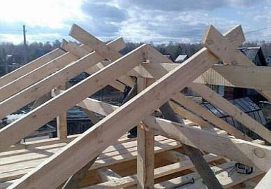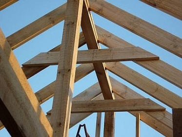● Для укрепления соединённых встык стропил применяются металлические или деревянные накладки. Металлическая накладка закрепляется с обеих сторон стропильной пары в области соединения с помощью болтов, а деревянная - гвоздями. ● Соединение стропил внахлёст - это соединение стропильных ног не срезанными торцами, а боковыми плоскостями внахлёст. Соединение делается с использованием шпилек с шайбами или болтов. Соединение внахлёст можно отнести к наиболее простым видам монтажа стропильных ног. Для упрощения и облегчения монтажа стропильной системы будет лучше сначала изготовить шаблоны. Для изготовления шаблона подойдёт доска такой же длины, как и стропильная нога. На этой доске делаются необходимые вырезы, а дальше по этому шаблону в спокойной обстановке на земле производится подготовка стропила перед подачей на крышу для монтажа. ● Для обеспечения надёжности всей кровли необходимо наличие обрешётки, которая может быть как сплошной, так и разреженной. Обрешётка монтируется из бруска или из необрезной доски. Если используется доска, то она крепится к каждому стропилу на два вбитых по краям гвоздя. При условии использования бруска он крепится к контробрешётке на один гвоздь в каждой точке крепления. |