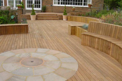 ● Нарастающим спросом пользуется декинг, или террасная доска (decking - "палубный настил"). Внешним видом он напоминает кладку палубной доски. Массивный декинг оптимально подходит для организации площадки для отдыха, организации пола открытой беседки, мощения пространства перед крыльцом дома, особенно эффектно он будет выглядеть при условии использования этого же материала при строительстве террасы. • Существуют несколько видов декинга: - из массива древесины (без добавок) - из древесно-полимерного композита (древесная мука и полимерное связующее) - комбинированный декинг - он же модульный, у которого подложка выполнена из пластика, а верхнее покрытие представляет собой деревянные ламели. • Декинг из массива - старейший вид террасной доски. Для создания настила используется ясень, лиственница и дуб, но также существуют панели из экзотических пород древесины, произрастающих в тропических странах и обладающих наивысшей долговечностью и стойкостью. Массивная доска имеет красивый и натуральный внешний вид, но требует регулярного ухода. При покупке данного материала продавцы будет лучше приобрести дополнительные средства ухода: масло, воск, пропитки для древесины. • Термодревесина для мощения используется в тех случаях, когда нет желания ухаживать за настилом. Термодревесина лишена недостатков, присущих деревянному покрытию - не боится влаги, не подвержена рассыханию, не разбухает, не синеет и не плесневеет. Такие отличные свойства массиву придаёт способ обработки материала водяным паром без доступа кислорода при температуре 230-240 °C. В результате этой обработки влага полностью удаляется из материала и весь свой срок службы термодревесина сохраняет свои геометрические размеры. Доска становится более лёгкой, приобретает ровный насыщенный оттенок, а внешне выглядит как обычное дерево. • ДПК-декинг сегодня переживает настоящий бум. ДПК-декинг является древесно-полимерным композитом - симбиозом дерева и пластика. Он не требует никакого ухода, очень стоек и долговечен и подвержен росту грибка. Сфера применения этого полунатурального материала весьма обширна. ДПК-декинг используется для оформления террас и придомовой территории, создания тропинок на участке, формирования береговой линии около дачного водоёма. На рынке строительных материалалов можно найти материал как с гладкой, так и рифлёной поверхностью (настил получается нескользким, что удобно для площадок у пруда или бассейна). Декинг отлично будет смотреться на детской площадке и даже внутри дома. • ДПК-декинг имеет ряд недостатков. Если деревянное покрытие подвержено биологическому заражению и гниению, то композитная террасная доска страдает несколько неестественным оттенком и прогибами. Именно поэтому её монтируют на предварительно подготовленные лаги с мелким шагом. Полость под настилом должна проветриваться - в противном случае даже стойкий композит начнёт местами плесневеть, хотя качественный материал не выгорает, поэтому его без проблем можно класть на открытые пространства. Также к минусам ДПК-декинга можно отнести его размеры и конфигурацию - как правило это длинные доски, в среднем по три метра. Для мощения узких садовых дорожек лучше использовать модульный декинг, который имеет пластиковое основание - небольшие ламели длиной 30 см, закреплённые н